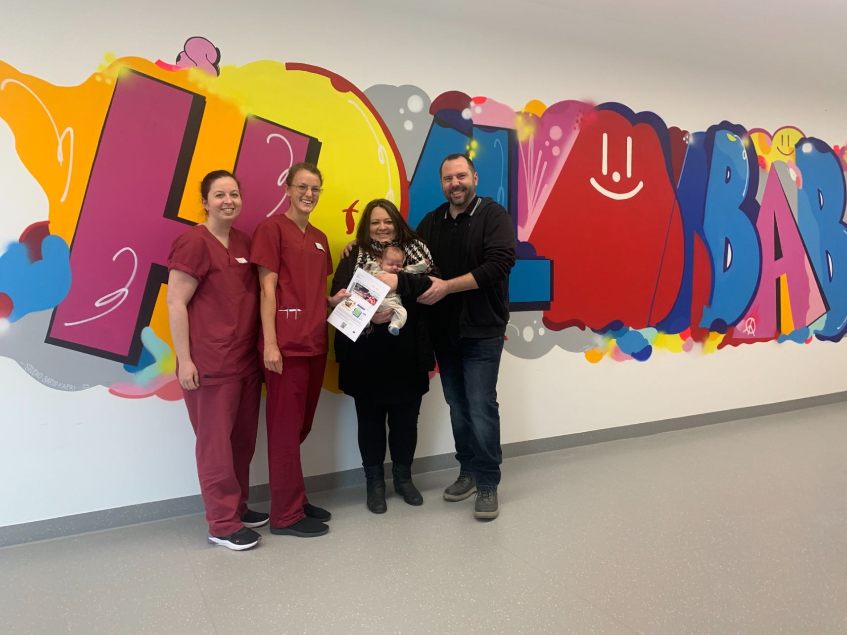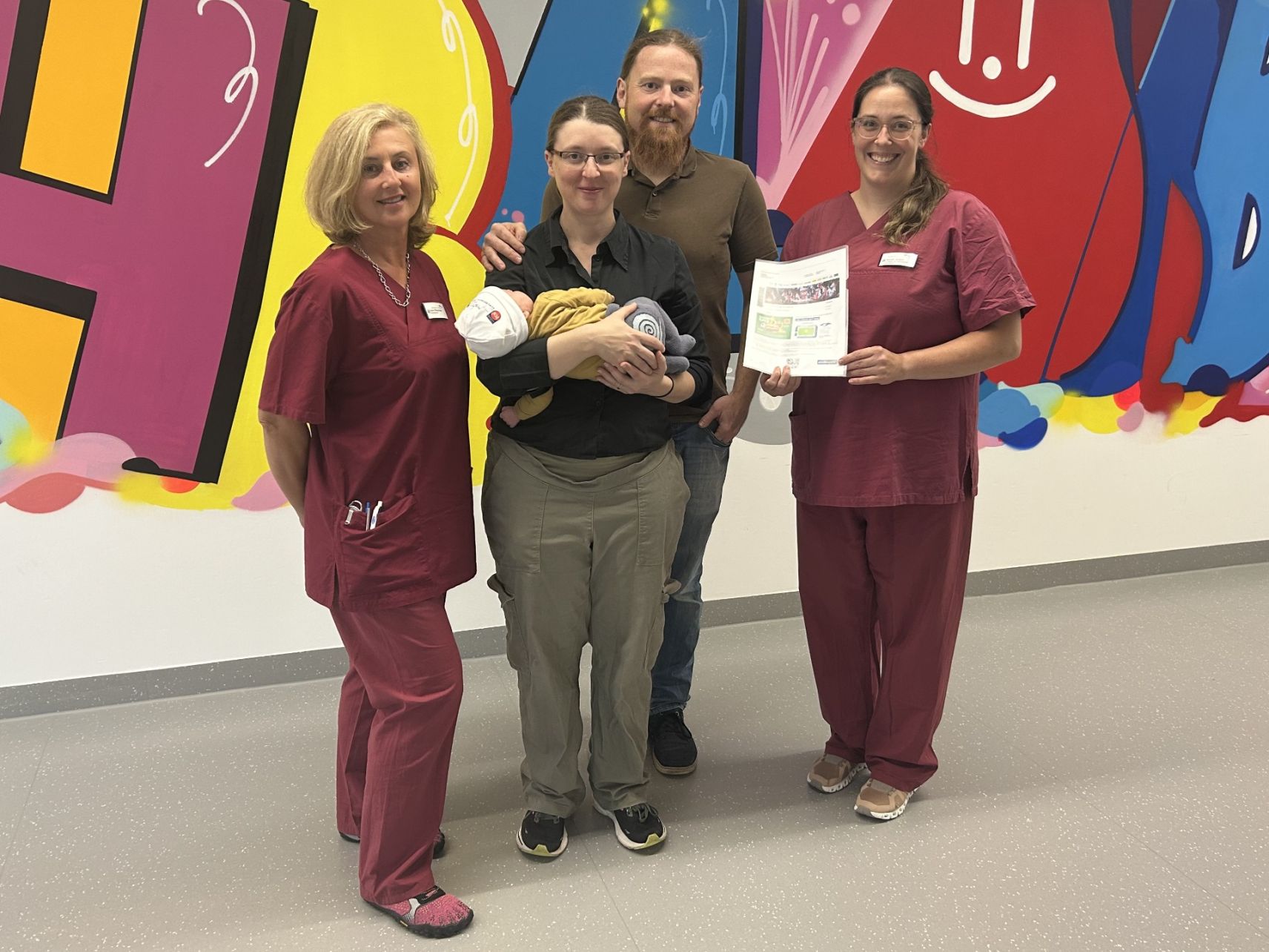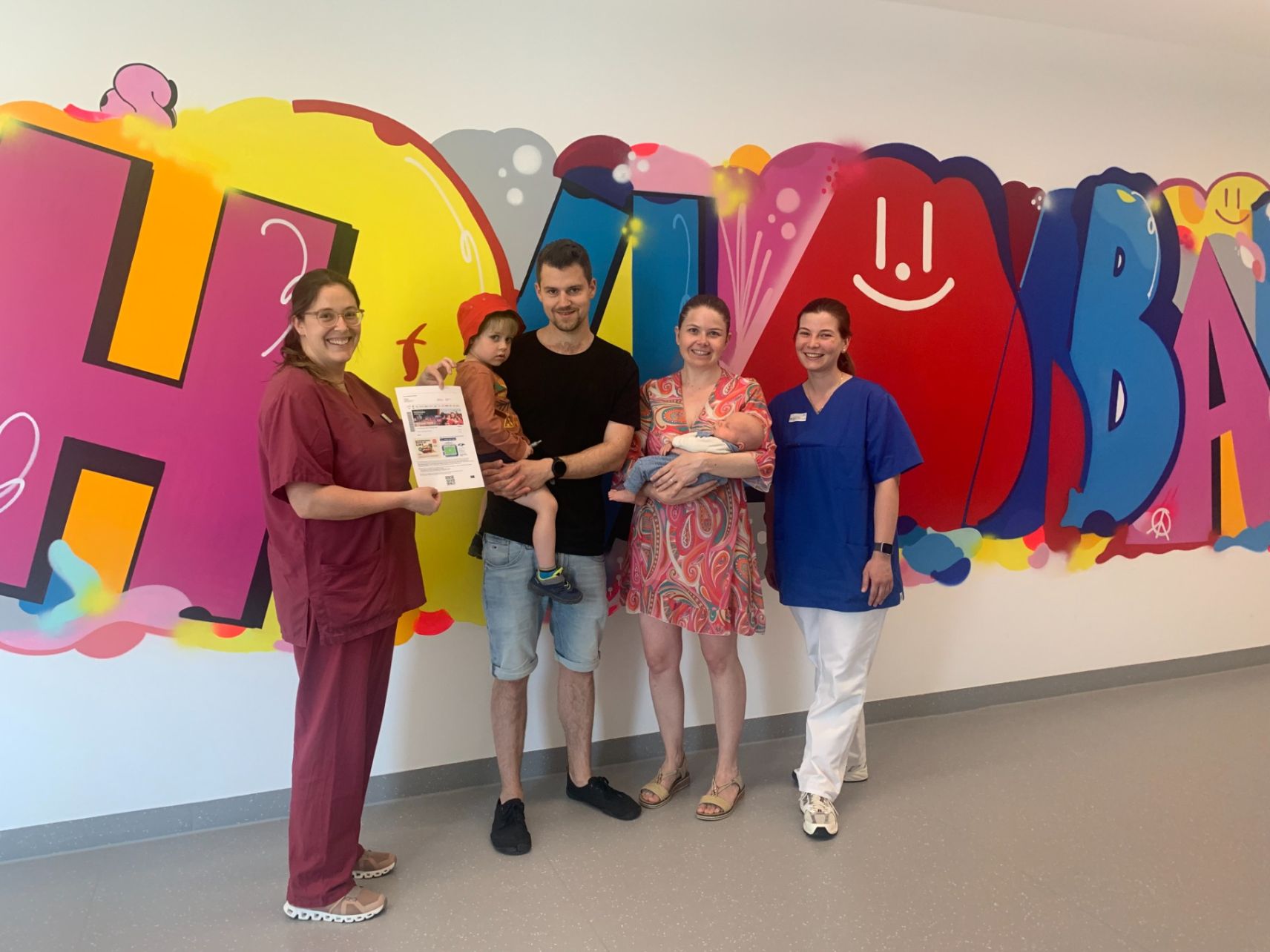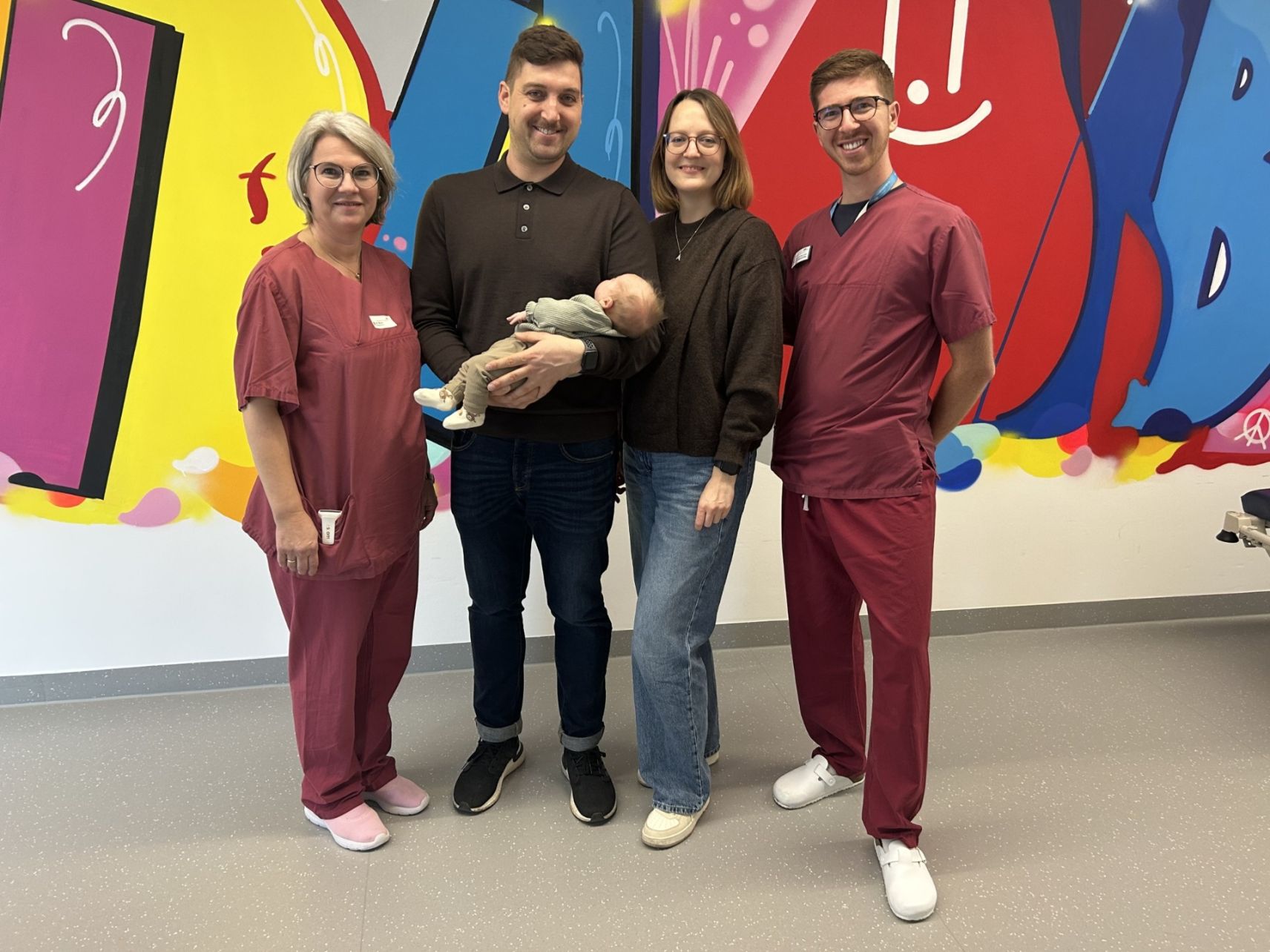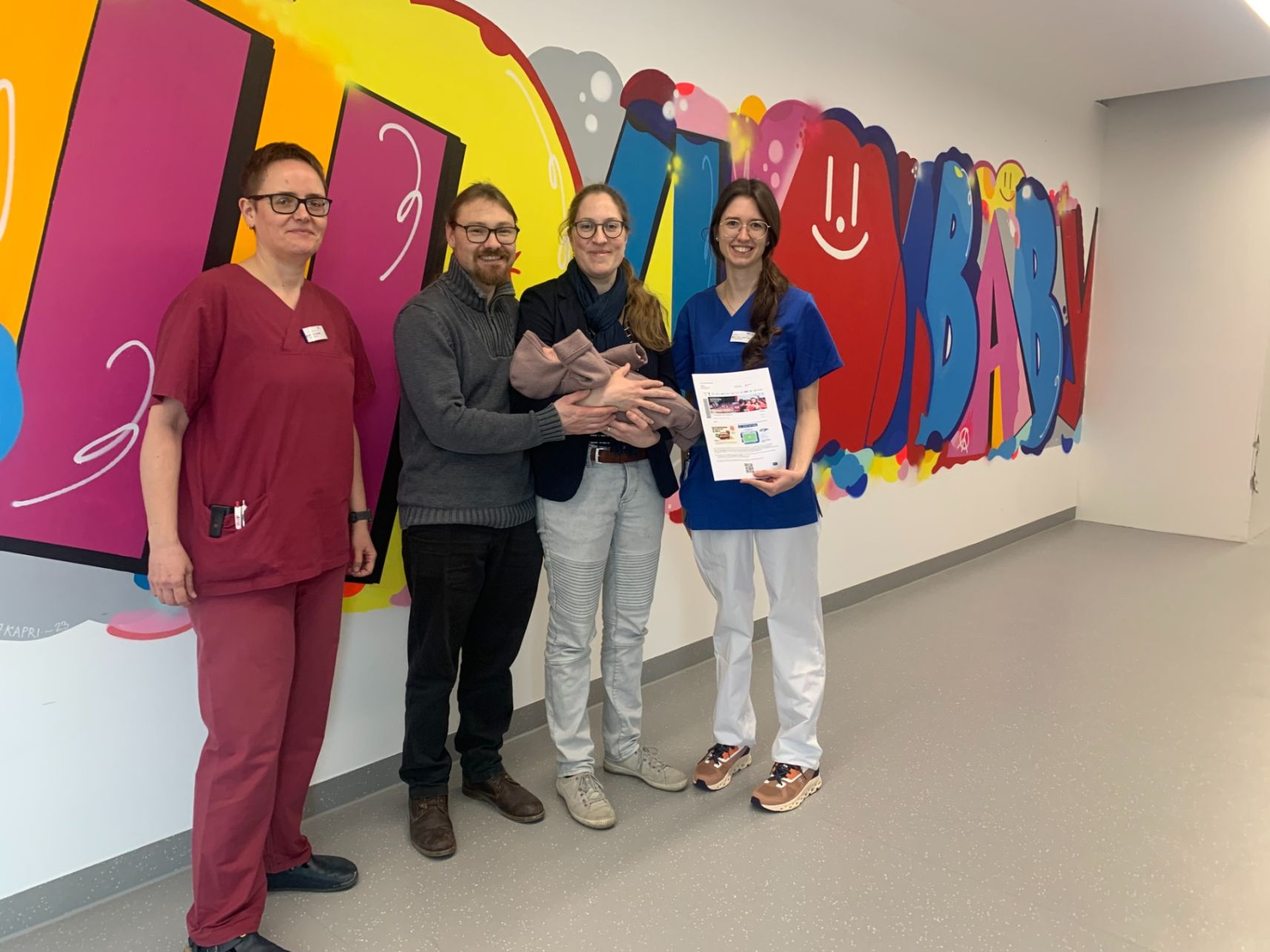 Benkißer, Papa Felix mit Liana auf dem Arm sowie Mama Alina und Gynäkologin